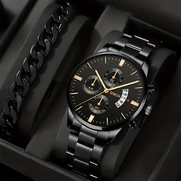 2pcs Men's New Popular Steel Strip Fashion Business Three Eye Quartz Watch Bracelet Set Valentine's Day Gifts